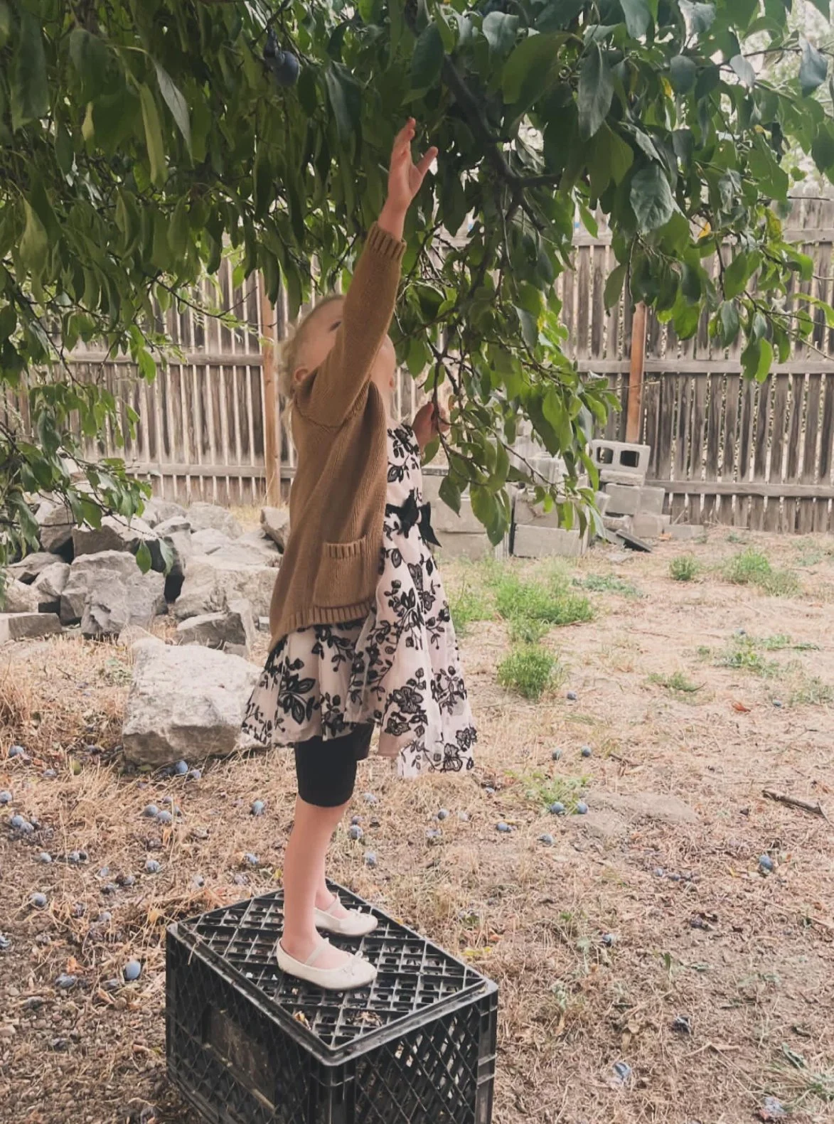 Oct 1, 2025: Little S picking plums from our new tree :) I still have no idea how to properly prune or care for this tree… a future me problem. For now, we enjoy the amazing fruit God grows in our new backyard. How do trees just do this!? It blows my mind. Creation is amazing.