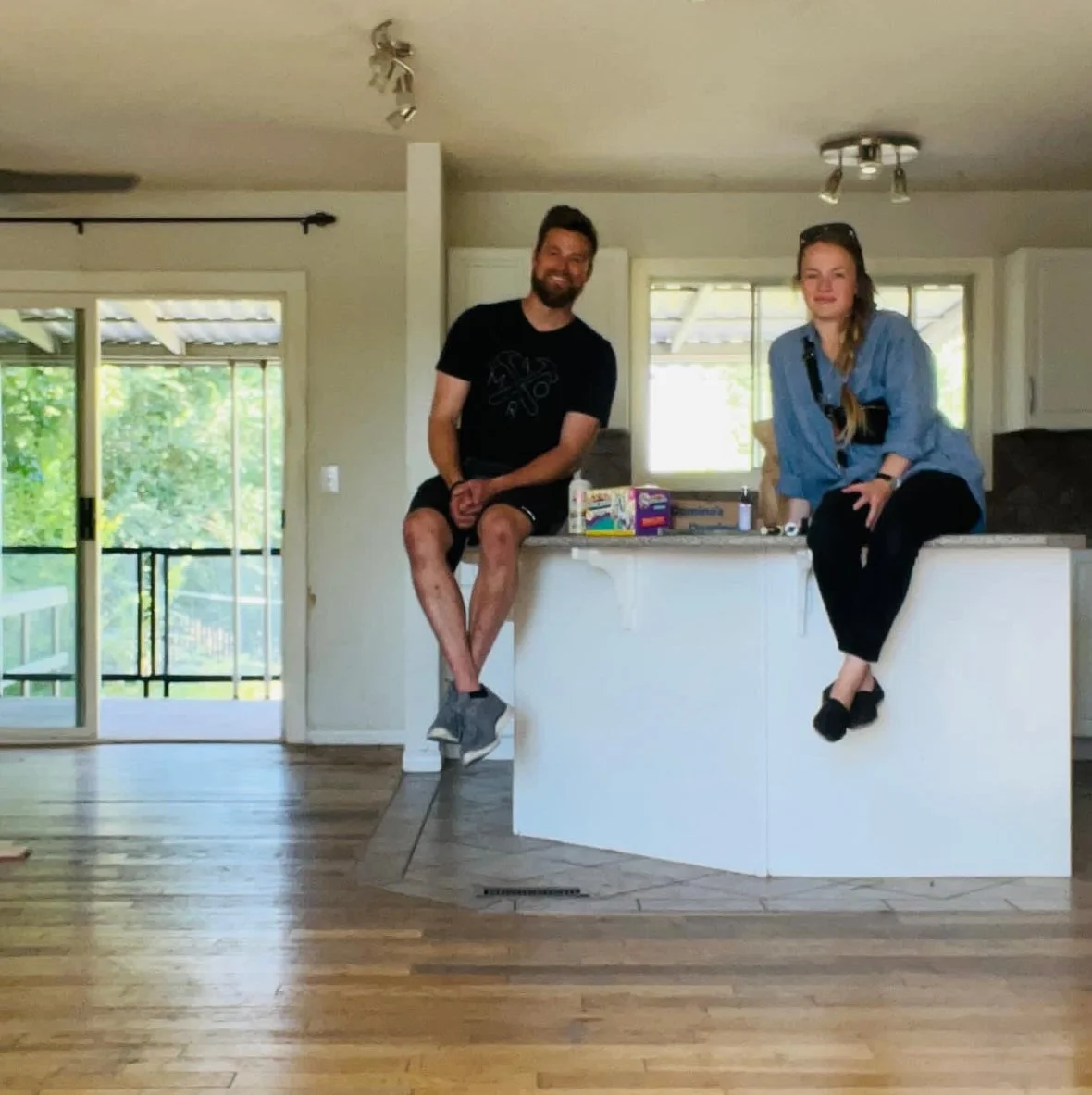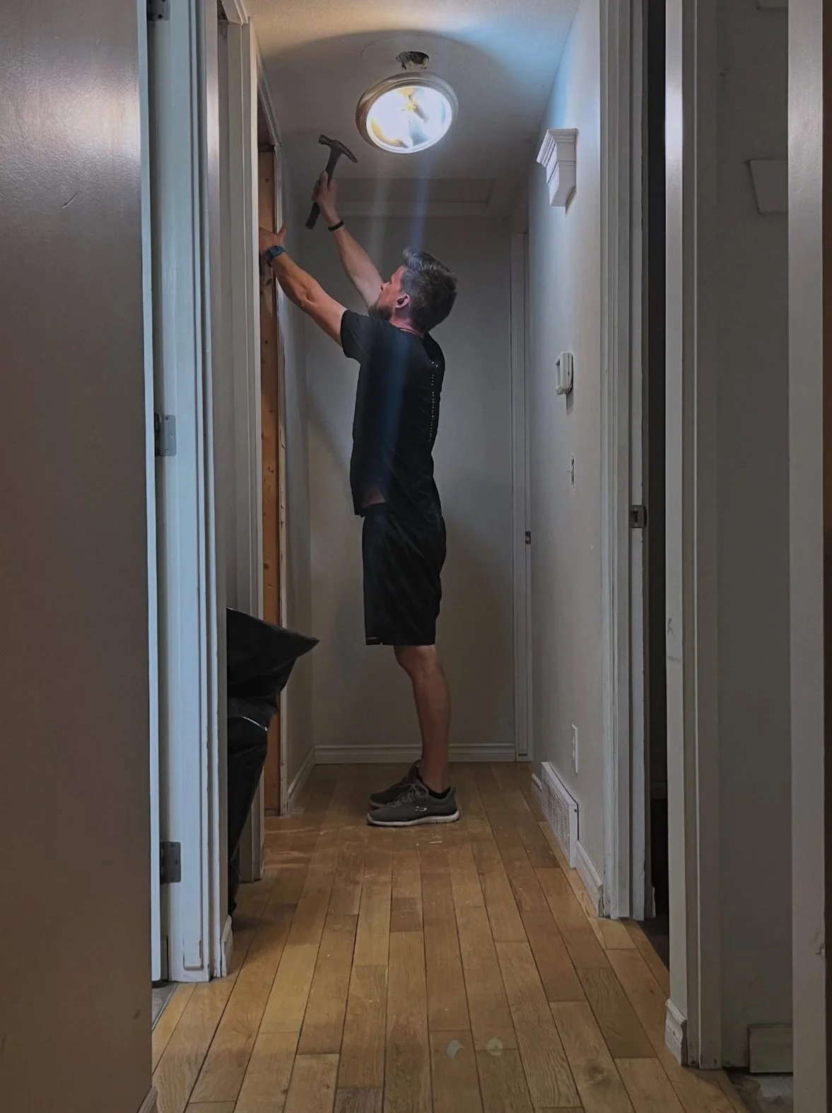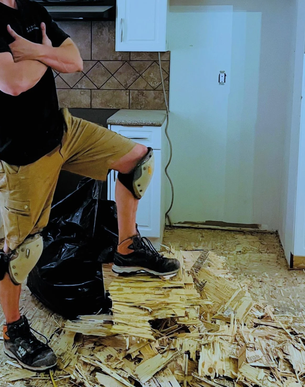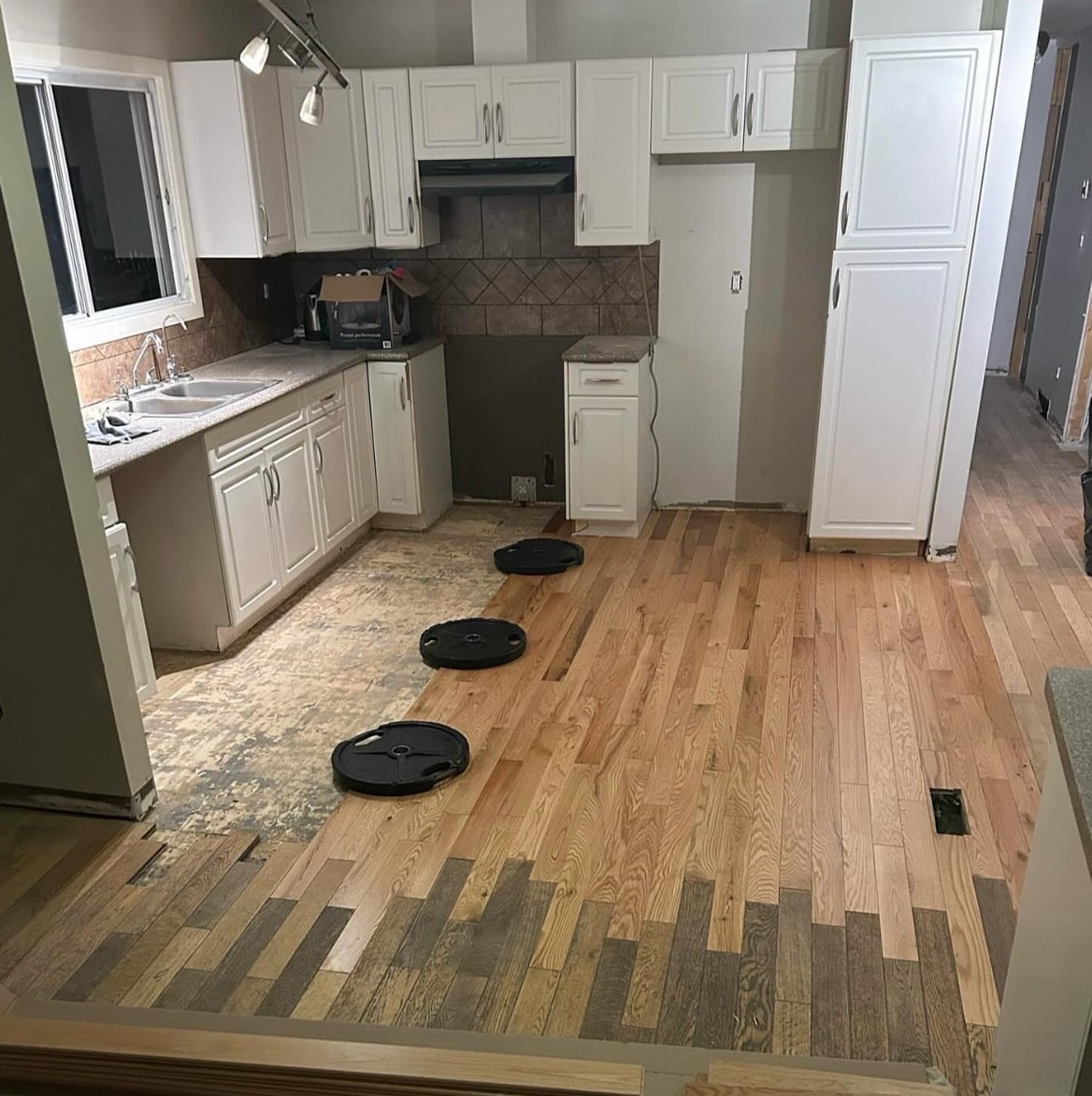 Aug 22, 2025: Evening after evening Kyle’s working hard to fill in the new hardwood floor where it used to be tile! And it’s a perfect colour match! Haha no, it will soon be sanded down, stained, and refinished.