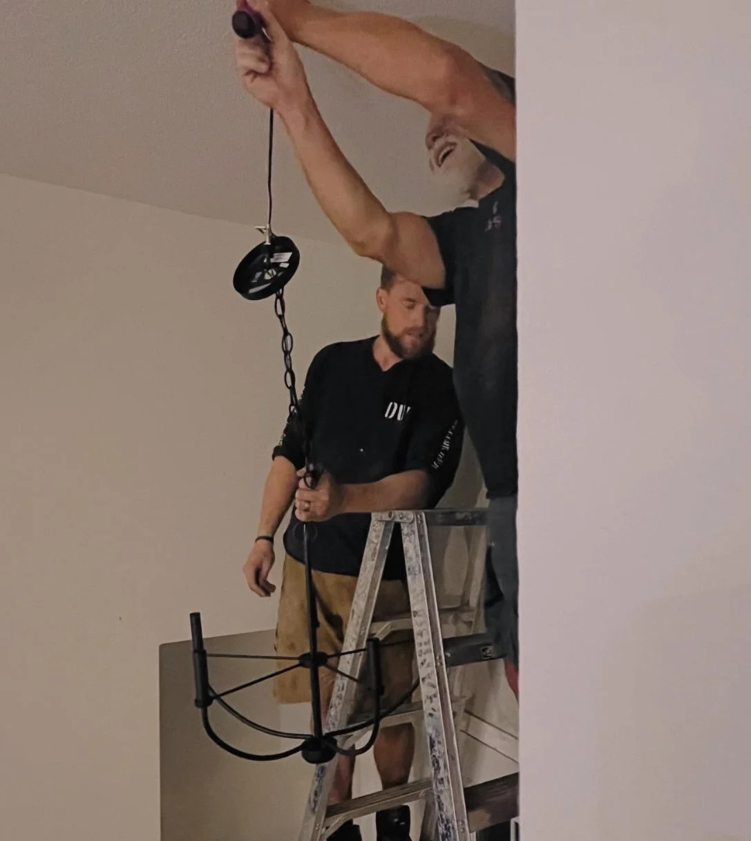 Sept 18, 2025: Team light fixtures (Kyle, Mike, and Norm)! The ceiling is repaired and painted, the new pot lights are cut out and installed, and marketplace is turning up some great light finds!